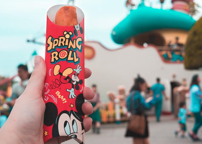 This is so not health food, but IT’S SO FREAKING GOOD! What more can I tell you besides that it’s literally a crispy, slightly sweet spring roll filled with hot gooey cheese and chunky pizza sauce. It tasted kind of like a pepperoni pizza, though I’m not sure if there’s actual pepperoni in the filling. Plus it comes in a cute and super convenient sleeve for mess free eating, and is one of the cheapest Tokyo Disney Snacks on the list. Found at a snack cart near Huey, Dewy and Louie’s Good Time Cafe at Disneyland.
